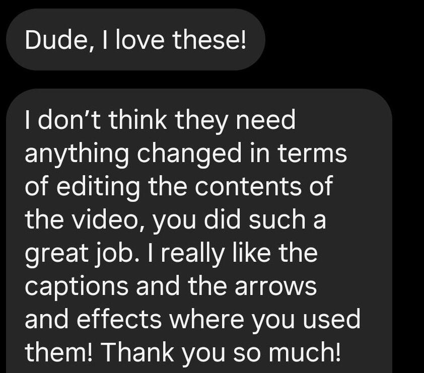 "videos looking great, thanks very much!"